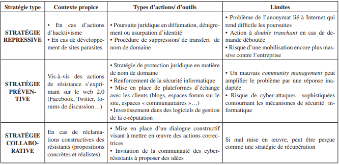 Le tableau suivant nous explique en détail le contexte d’utilisation, le type d’actions et les limites de ces stratégies :