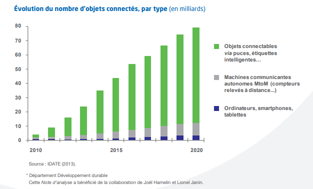 Entre 2010 et 2020, le nombre d’objets connectables avec des puces et des étiquettes intelligentes augmente considérablement, en effet il y’en a environ 4 milliards en 2010 et près de 80 milliards en 2020, d’après le graphique ci-dessus.