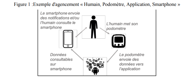 Ci-dessous un exemple d’agencement qui relie : l’Humain, le podomètre, l’application et le smartphone. Ce schéma nous permet de bien comprendre comment se présente la théorie de l’agencement entre plusieurs acteurs.