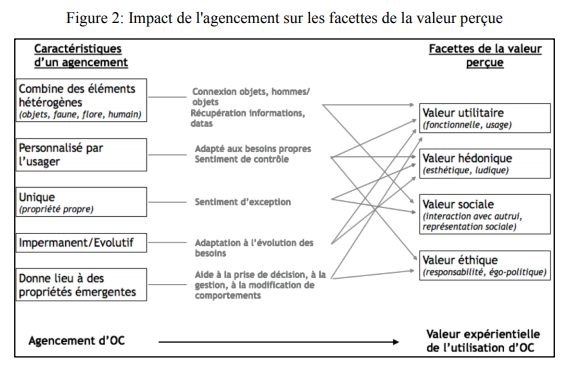 La théorie de l’agencement pour les objets connectés n’empêche pas les freins à la consommation. En effet, les freins à la consommation sont divers : « des freins tout d’abord psychologiques, comme la peur du piratage, la perte de contrôle sur les données récoltées, l’intrusion dans la vie privée, ou encore la dépendance. » (Pauline Folcher, Sarah Mussol, 2018, p.6). Il existe également d’autres freins à la consommation comme le prix des objets connectés, la complexité de certains d’entre eux, le manque de garantie au niveau de la sécurité. La théorie de l’agencement a un impact sur les valeurs perçues des objets connectés. Le schéma suivant nous démontre cet impact sur les valeurs perçues par les consommateurs.